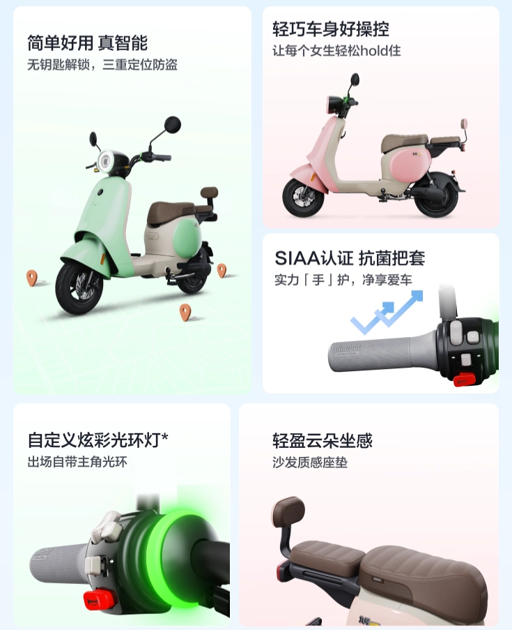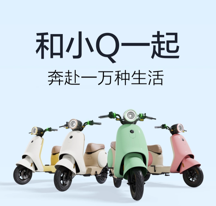 九号电动小 Q 是一款新国标电动自行车,采用多彩配色,车身设计轻巧,方便女生骑行。