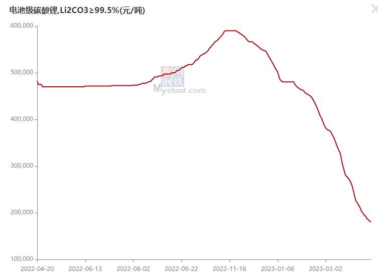 金融界4月20日消息 据上海钢联发布数据显示,今日锂电材料报价全部下跌,电池级碳酸锂下跌2500元/吨,均价报18万元/吨,工业级碳酸锂下跌2500元/吨,均价报13.5万元/吨;氢氧化锂下跌10000元/吨;镍豆下跌60元/吨。