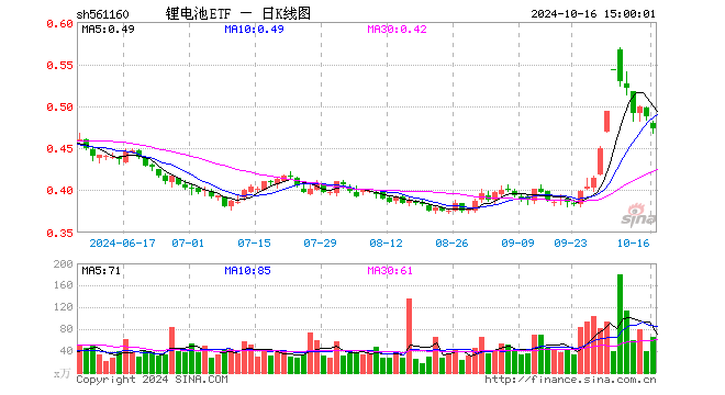 规模方面,截止10月15日,锂电池ETF(561160)最新份额为14.66亿份,最新规模为7.10亿元。回顾2023年12月29日,锂电池ETF(561160)份额为19.13亿份,规模为9.42亿元。即该基金今年以来份额减少23.36%,规模减少24.59%。