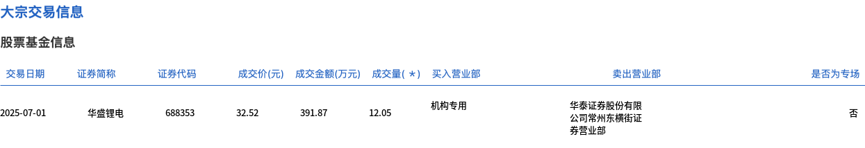 7月1日,华盛锂电大宗交易成交12.05万股,成交额391.87万元,占当日总成交额的1.41%,成交价32.52元,较市场收盘价33.02元折价1.51%。