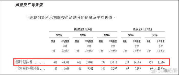 招股说明书显示:自2023年以来,锂离子电池材料的价格持续下滑。2025年上半年平均售价为13766元/吨,不到2022年的1/3。
