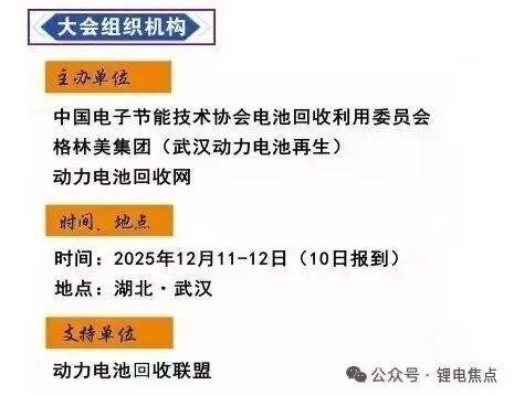 动力电池回收网消息,“2025中国动力电池回收利用行业回收年会暨新型、高效提锂技术发展论坛”将于12月11-12日在武汉举办,规模:500+,大会主题:绿色循环·高效提锂。