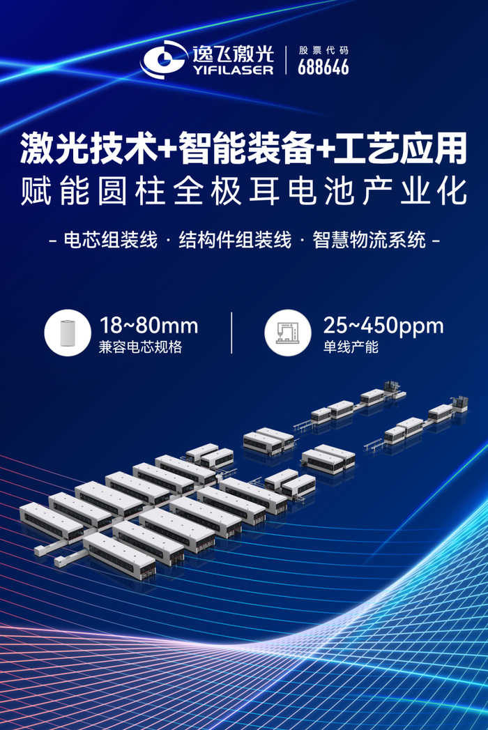 成立近20年来,逸飞激光以“激光技术+智能装备+工艺应用”三维一体创新体系为驱动,形成了以精密激光加工技术为核心、以智能制造装备为载体的技术和产品体系。在新能源电池装备领域,已打造了一系列“圆柱全极耳电芯自动装配线,方形电芯自动装配线,电池模组/PACK自动装配线、新能源电池整厂智慧物流解决方案”等产品。客户已覆盖国内头部电池厂商,并拓展至欧洲、东南亚、美洲等国家和地区。