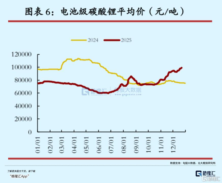 供应端来看,近3年来,碳酸锂行业在价格深跌后开启主动供给侧改革,导致库存加速去化,目前已跌至三年低位。2025年11月,全国碳酸锂产量约6.6万吨,环比下降0.2%;氢氧化锂产量约3.4万吨,环比下降1.4%,锂盐总产量折合碳酸锂当量(LCE)约9.6万吨,环比下降0.6%,整体供应呈现收缩态势。