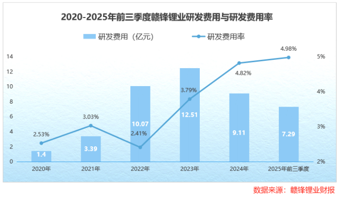 2020年到2025年前三季度,公司累计投入研发费用43.77亿元。2025年前三季度,其研发费用率为4.98%,超过了天齐锂业、盛新锂能等锂电公司。