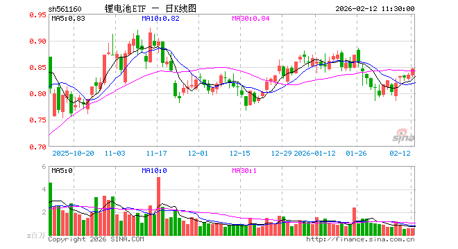 2月12日,截止午间收盘,锂电池ETF(561160)涨1.44%,报0.847元,成交额4917.08万元。锂电池ETF(561160)重仓股方面,宁德时代截止午盘涨2.57%,阳光电源涨2.96%,三花智控涨1.15%,亿纬锂能涨1.60%,天赐材料涨1.32%,先导智能跌0.05%,格林美涨1.79%,国轩高科跌0.53%,多氟多跌0.66%,欣旺达涨0.78%。
